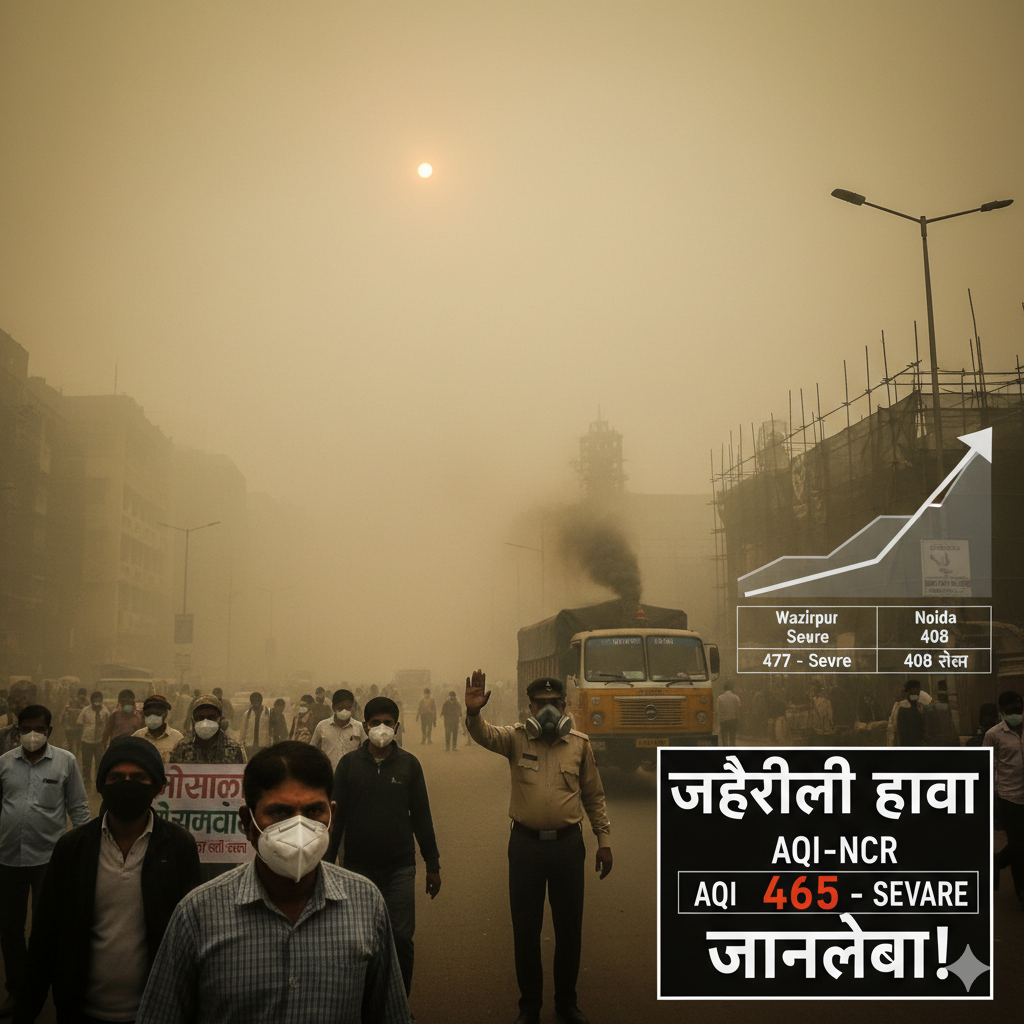 : राष्ट्रीय राजधानी क्षेत्र (NCR) पिछले कई दिनों से एक बार फिर गंभीर वायु प्रदूषण की चपेट में है। यहाँ की हवा लगातार 'गंभीर' (Severe) श्रेणी में बनी हुई है, जिससे क्षेत्र में स्वास्थ्य आपातकाल जैसे हालात बन गए हैं। केंद्रीय प्रदूषण नियंत्रण बोर्ड (CPCB) के अनुसार, दिल्ली का औसत वायु गुणवत्ता सूचकांक (AQI) 400 के पार बना हुआ है, जबकि कई हॉटस्पॉट इलाकों में यह 450 से 477 तक पहुँच गया है, जो बेहद जानलेवा स्तर है।