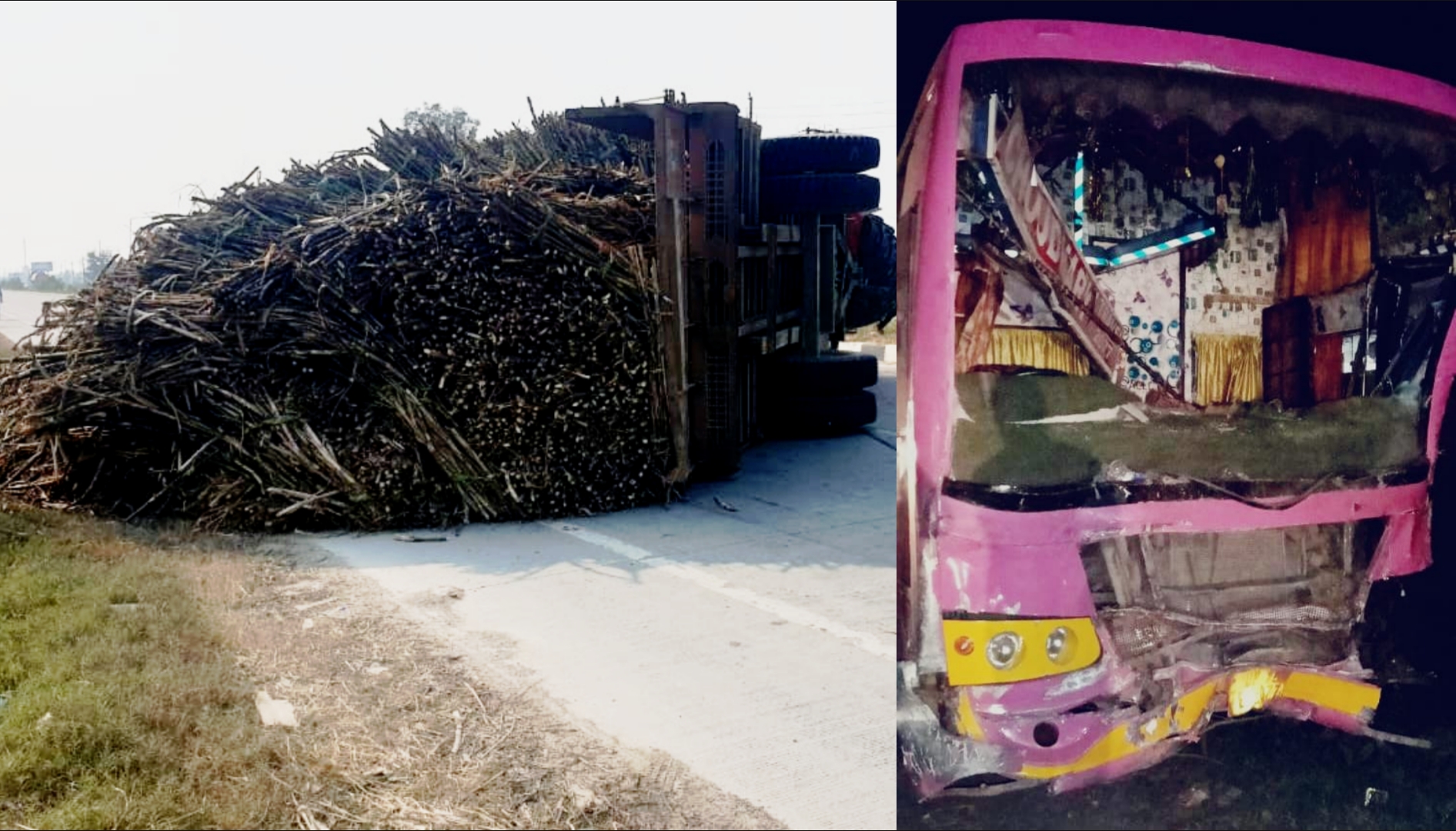 गन्ना भरी ट्रालियाँ ट्रक की टक्कर के बाद : विपरीत दिशा में पलटी,तेज रफ्तार आ रही डबल डेकर बस की धमाकेदार टक्कर से मची चीख पुकार दर्जन भर यात्री घायल!