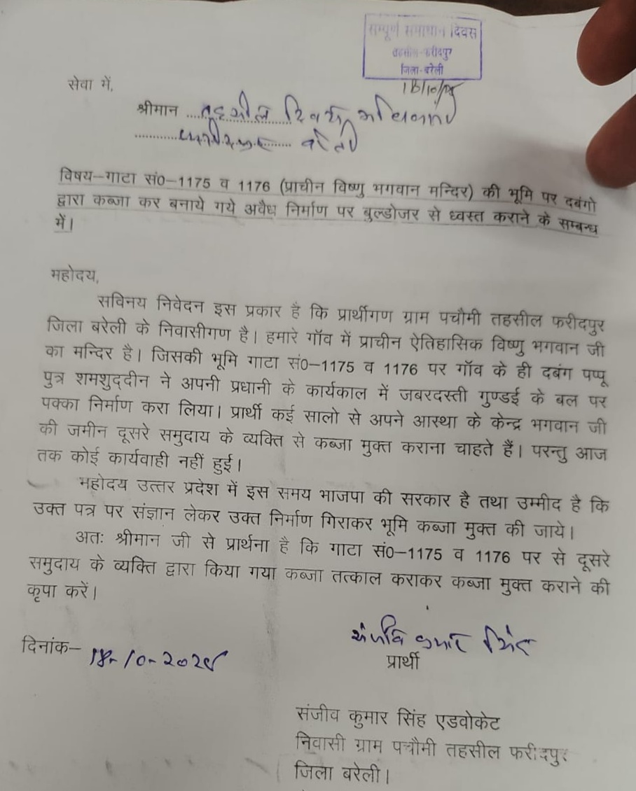 : बरेली जनपद के फरीदपुर के पचोमी में दबँगो ने भगवान विष्णु मन्दिर की भूमि को भी नही छोड़ा,अबैध कब्जा कर कराया निर्माण!