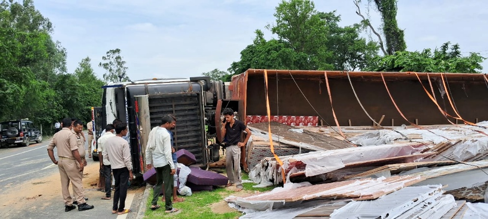 : बरेली में कार बचाने के चक़्कर में प्लाई बोर्ड भरा ट्रक हाइवे पर पलटने से लगा जाम!