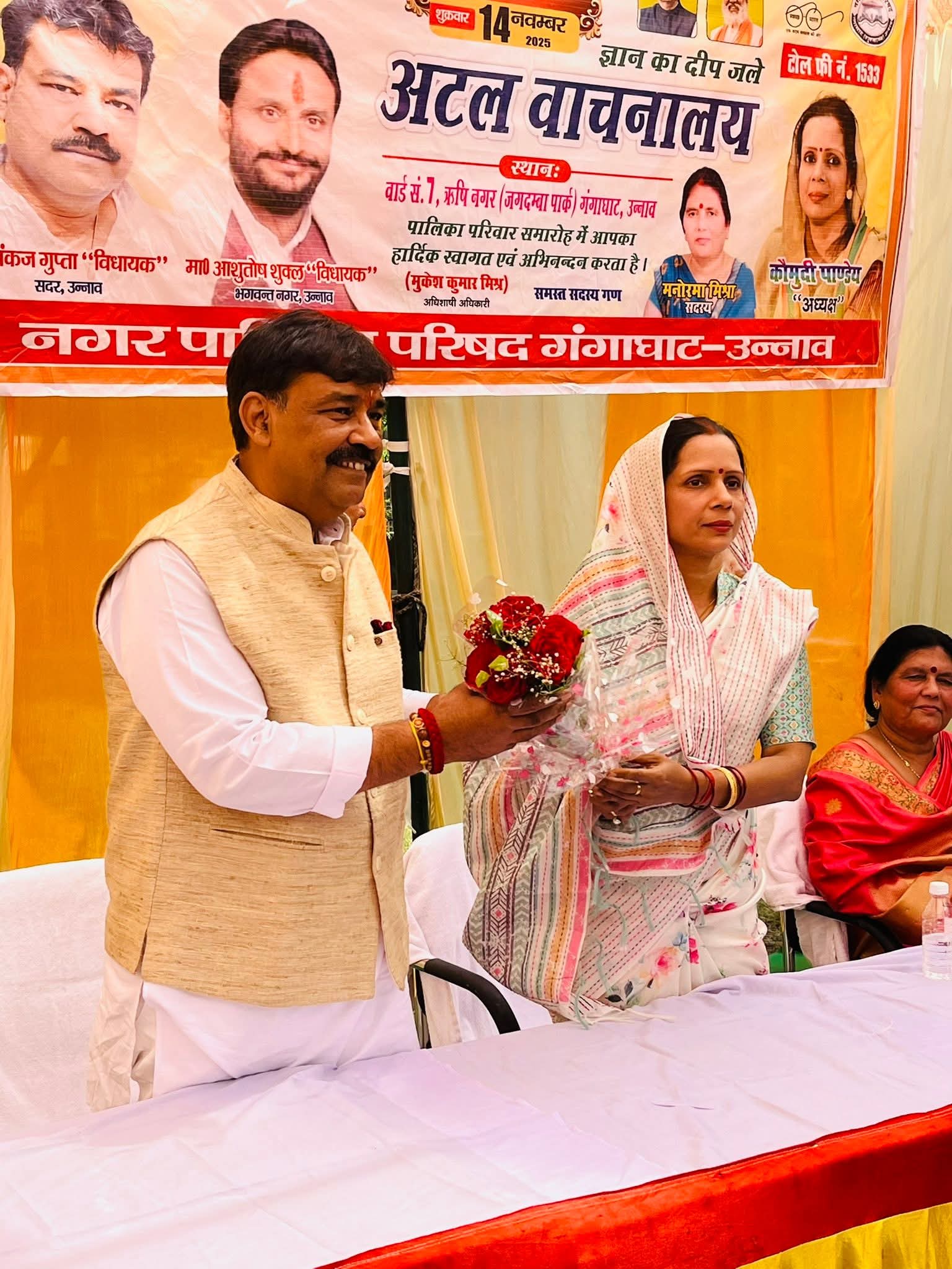 उन्नाव। नगर पालिका परिषद गंगाघाट द्वारा ऋषि नगर स्थित जगदंबा पार्क में अटल वाचनालय का उद्घाटन बुधवार को किया गया। बाल दिवस पर शुरू की गई यह सुविधा क्षेत्र के विद्यार्थियों को शांत और सुव्यवस्थित अध्ययन का वातावरण देगी। कार्यक्रम में मुख्य अतिथि के रूप में सदर विधायक पंकज गुप्ता और पालिका अध्यक्ष कौमुदी पांडे मौजूद रहीं। दोनों ने माँ सरस्वती के चित्र पर माल्यार्पण कर दीप प्रज्वलित किया।