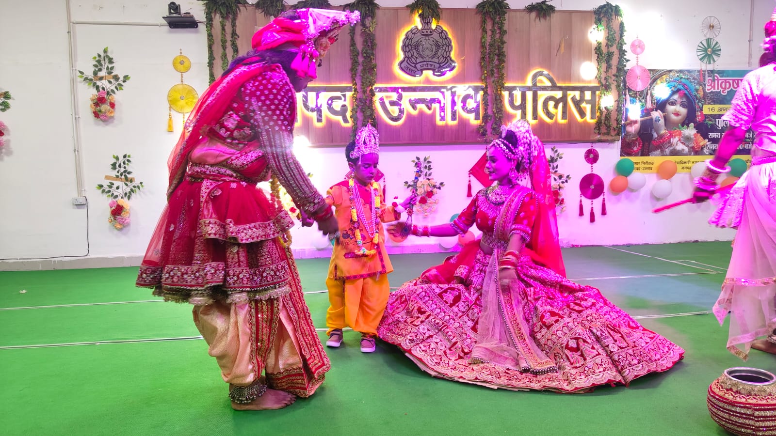 उन्नाव। । उन्नाव की रिज़र्व पुलिस लाइन गुरुवार देर रात भक्तिमय वातावरण से सराबोर रही। जन्माष्टमी के उपलक्ष्य में पुलिस प्रशासन द्वारा आयोजित सांस्कृतिक संध्या में जब नन्हे बच्चों और पेशेवर कलाकारों ने राधा-कृष्ण, शिव भक्ति और ब्रज नृत्य प्रस्तुत किए तो ऐसा लगा मानो पूरा परिसर वृंदावन बन गया हो। पुलिस अधीक्षक दीपक भूकर के मार्गदर्शन में सजे आकर्षक मंच पर एक से बढ़कर एक सांस्कृतिक प्रस्तुतियां हुईं जिन्हें देख दर्शक तालियों से मंच गूंजाते रहे।
