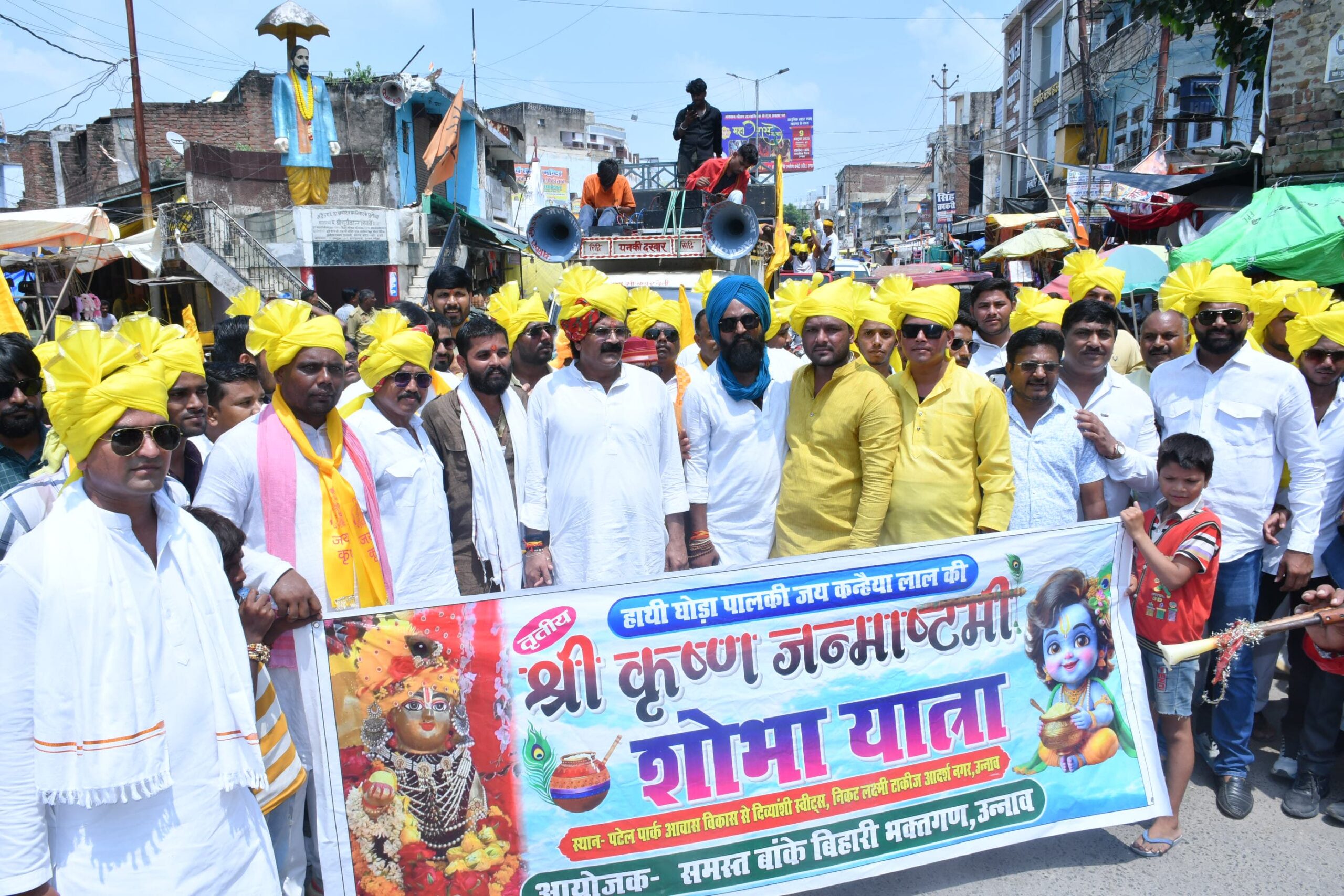 उन्नाव। शहर की गलियों में जब बैंड-बाजों की धुन गूँजी और जय कन्हैयालाल की जयघोष से वातावरण गूंज उठा, तो हर ओर कृष्ण भक्ति का उत्सव जीवंत हो उठा। राधा-कृष्ण की झांकियों से सजे रथ और नन्हे बच्चे बाल गोपाल की वेशभूषा में आकर्षण का केंद्र बने रहे। जैसे ही शोभायात्रा आगे बढ़ी, श्रद्धा व उल्लास से पूरा शहर कृष्णमय दिखाई देने लगा। हर गली-चौराहे से पुष्पवर्षा और ‘कन्हैया लाल की जय’ के स्वर सुनाई दे रहे थे।