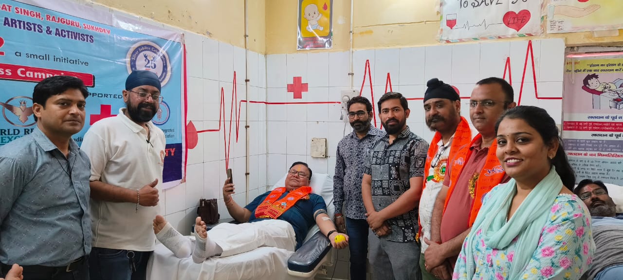 उत्तर प्रदेश फतेहपुर : सर्व फॉर ह्यूमैनिटी एवं नेशनल इंट्रीग्रेटेड फॉर्म ऑफ आर्टिस्ट एक्टिविस्ट के तत्वधान में लगे शहीद भगत सिंह ,शहीद राजगुरु, शहीद सुखदेव जी के शहीदी दिवस के उपलक्ष्य में जिला अस्पताल रक्तकेन्द्र में लगे रक्तदान शिविर में मुख्य चिकित्सा अधिकारी समेत 23 ने किया रक्तदान किया रक्तदान शिविर का उदघाटन मुख्य चिकित्सा अधिकारी राजीव नयन गिरी ,विद्या कोचिंग प्रबंधक गुरमीत सिंह व आनंद मौर्य ने फीता काटकर किया, रक्तदान करने वालो में कुलदीप सिंह, अमनजोति तिवारी,शुभम पटेल,महेश कुमार,शैलेश कुमार,अमित कुमार,गौरव त्रिवेदी,इमरोज खान,फिरोज हैदर,अतुल सिंह,शिखर मौर्य,कुलदीप सिंह,कंवलजीत सिंह,डॉक्टर राजीव नयन गिरी (42 वा रक्तदान),राज गुप्ता,गुरमीत सिंह (42 वा रक्तदान),मयंक कुमार,अभिषेक सिंह,शिवांशु शुक्ला,सचिन सिंह,राजेश कुमार मौर्य, शशिकांत, सपना,कृपा शंकर ने रक्तदान कर शहीदों को श्रद्धांजलि अर्पित किया, जिला अस्पताल रक्तकेंद्र से मेडिकल ऑफिसर अभिषेक सिंह, टेक्निकल सुपरवाइजर अशोक शुक्ला, परामर्श दाता दीपाली वर्मा, लैब टेक्नीशियन बृज किशोर , संतोष राजपूत, लैब सहायक गोविंद सिंह, अजय सर्व फॉर ह्यूमैनिटी से गुरमीत सिंह, अतर सिंह ,सावन गुप्ता,शोभित सिंह, उपस्थित रहे ।।।