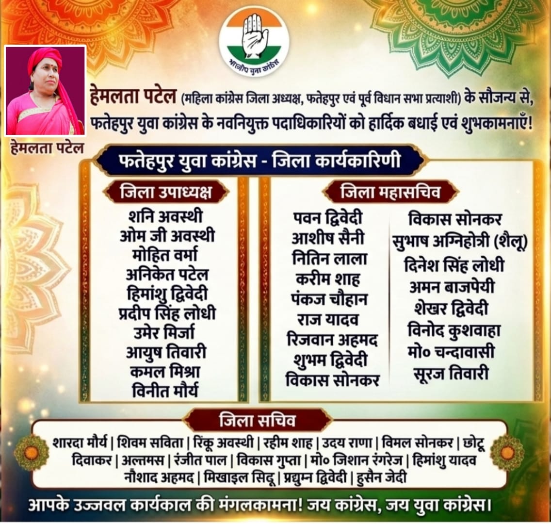 उत्तर प्रदेश युवा कांग्रेस (पूर्वी) के प्रदेश अध्यक्ष विशाल सिंह एवं राष्ट्रीय सचिव व प्रभारी विवेक बघेल की संस्तुति पर फतेहपुर जनपद की नई युवा कांग्रेस जिला कार्यकारिणी का आधिकारिक गठन कर दिया गया है। इस नवीन कार्यकारिणी में जमीनी स्तर पर सक्रिय और निष्ठावान कार्यकर्ताओं को महत्वपूर्ण जिम्मेदारियां सौंपी गई हैं।