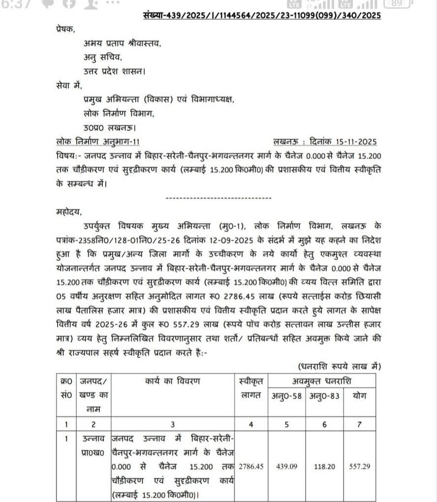उन्नाव। बीघापुर से भगवंतनगर को जोड़ने वाले मुख्य मार्ग के चौड़ीकरण का रास्ता आखिर साफ हो गया है। शासन ने लोक निर्माण विभाग के प्रस्ताव पर मुहर लगा दी है। विभाग को करीब 27 करोड़ 86 लाख रुपये से ज्यादा की राशि जारी की गई है। मंजूरी मिलते ही इलाके में लोगों की उम्मीदें फिर तेज हो गई हैं।यह योजना कई सालों से अटकी थी। स्थानीय जनता बार-बार इसकी जरूरत बताती रही थी। विधायक आशुतोष शुक्ला ने हाल ही में मुख्यमंत्री योगी आदित्यनाथ से मुलाकात कर फाइल को आगे बढ़ाने की मांग रखी थी। इसके बाद सरकार ने पूरी परियोजना को हरी झंडी दे दी। पीडब्ल्यूडी के मुताबिक स्वीकृति बिहार-सरेनी-चैनपुर होकर भगवंतनगर तक करीब पंद्रह किलोमीटर से ज्यादा हिस्से के चौड़ीकरण और सौंदर्यकरण के लिए है। सड़क को मजबूत ढांचे के साथ तैयार किया जाएगा ताकि भारी वाहनों का दबाव आसानी से झेल सके। किनारों की मरम्मत, नालियों और सुरक्षा व्यवस्था पर भी काम होगा।अनुमान है कि टेंडर और अन्य औपचारिकताएं पूरी होते ही निर्माण तेजी से शुरू हो जाएगा। इस मार्ग से रोजाना हजारों लोग गुजरते हैं। सड़क दुरुस्त होने पर समय बचेगा, दुर्घटनाओं में कमी आएगी और आसपास के गांवों को सीधा फायदा मिलेगा। विधायक आशुतोष शुक्ला ने कहा कि यह सड़क क्षेत्र की लाइफ लाईन की तरह है। चौड़ीकरण से गांवों के बीच आवागमन आसान होगा और कारोबारी गतिविधियों को भी सहारा मिलेगा। उन्होंने परियोजना को मंजूरी देने के लिए मुख्यमंत्री का धन्यवाद किया।
