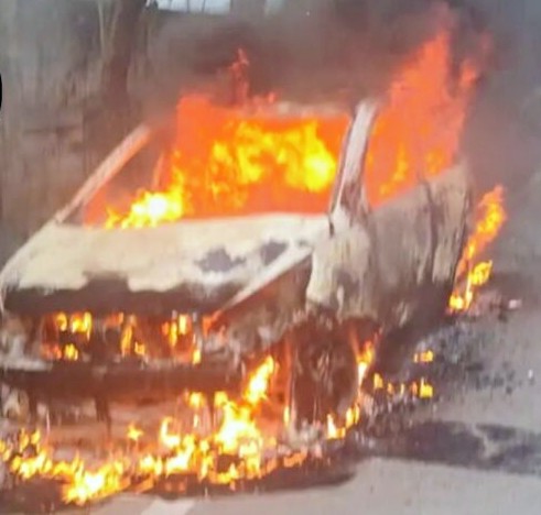 खड़ी कार बनी आग का गोला : भीषण आग की लपटों में कार जलकर हुई राख,मची चीखपुकार,कड़ी मशक्कत के बाद फायर ब्रिगेड ने पाया काबू